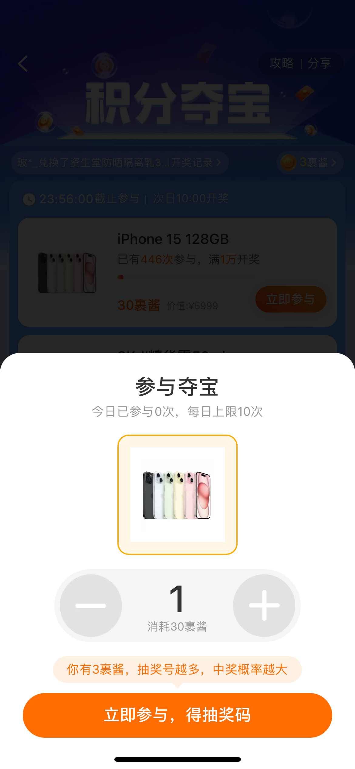 最后点击下面的立即参与得抽奖码选项即可。