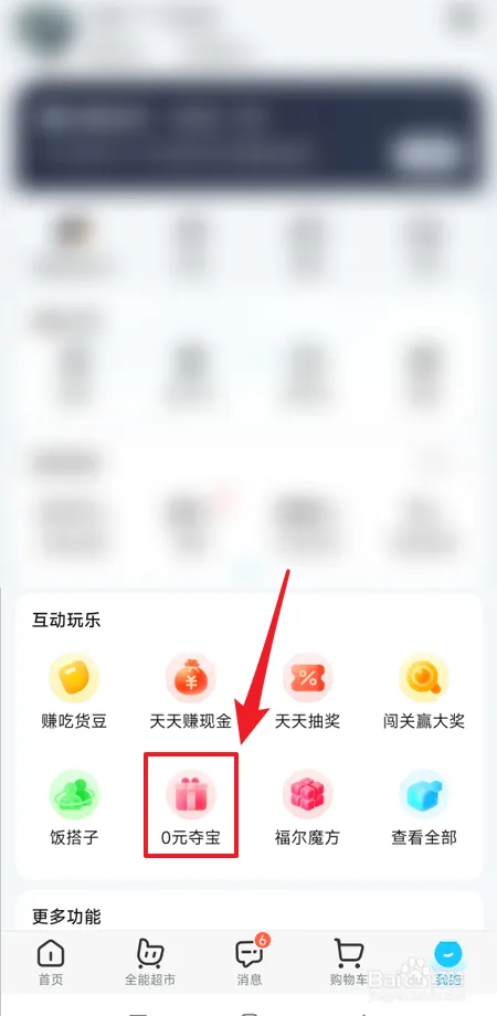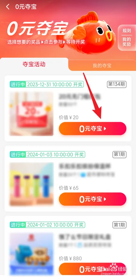 进入【0元夺宝】页面,点击【0元夺宝】按钮即可参加活动。
